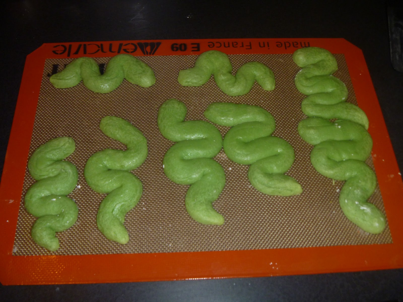 On a clean surface, powder lightly with powdered sugar. Pull a baseball sized lump of dough from the fridge. Roll into 1/3" wide lengths. slice them ~6-7" long and on the tray, create your snake. Good rule of thumb we found is: 2 Squiggles is a worm, 3-4 is a snake, even squiggles are intestines. Taper one end into a point and create a lumpy "head" at the other end.